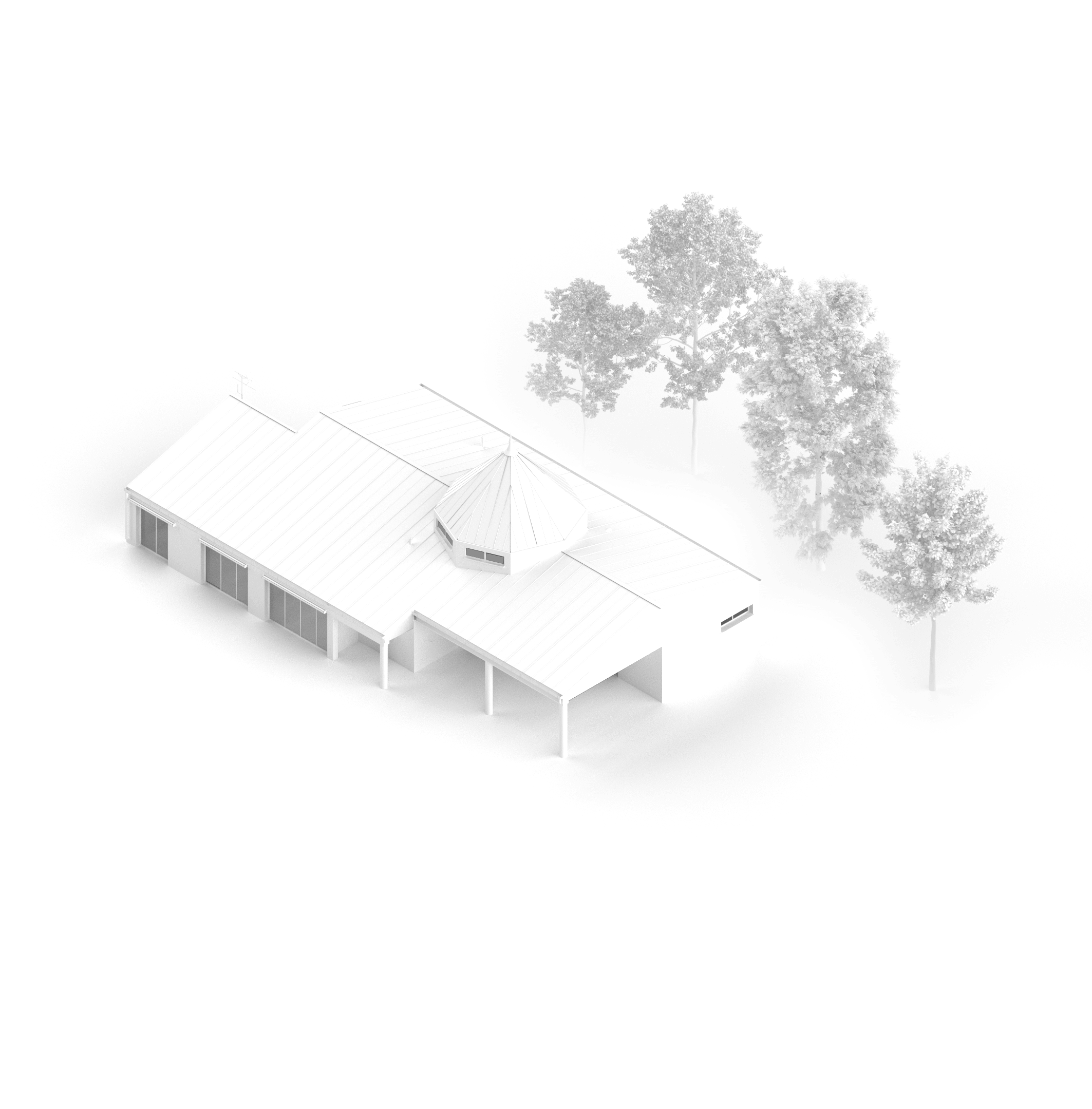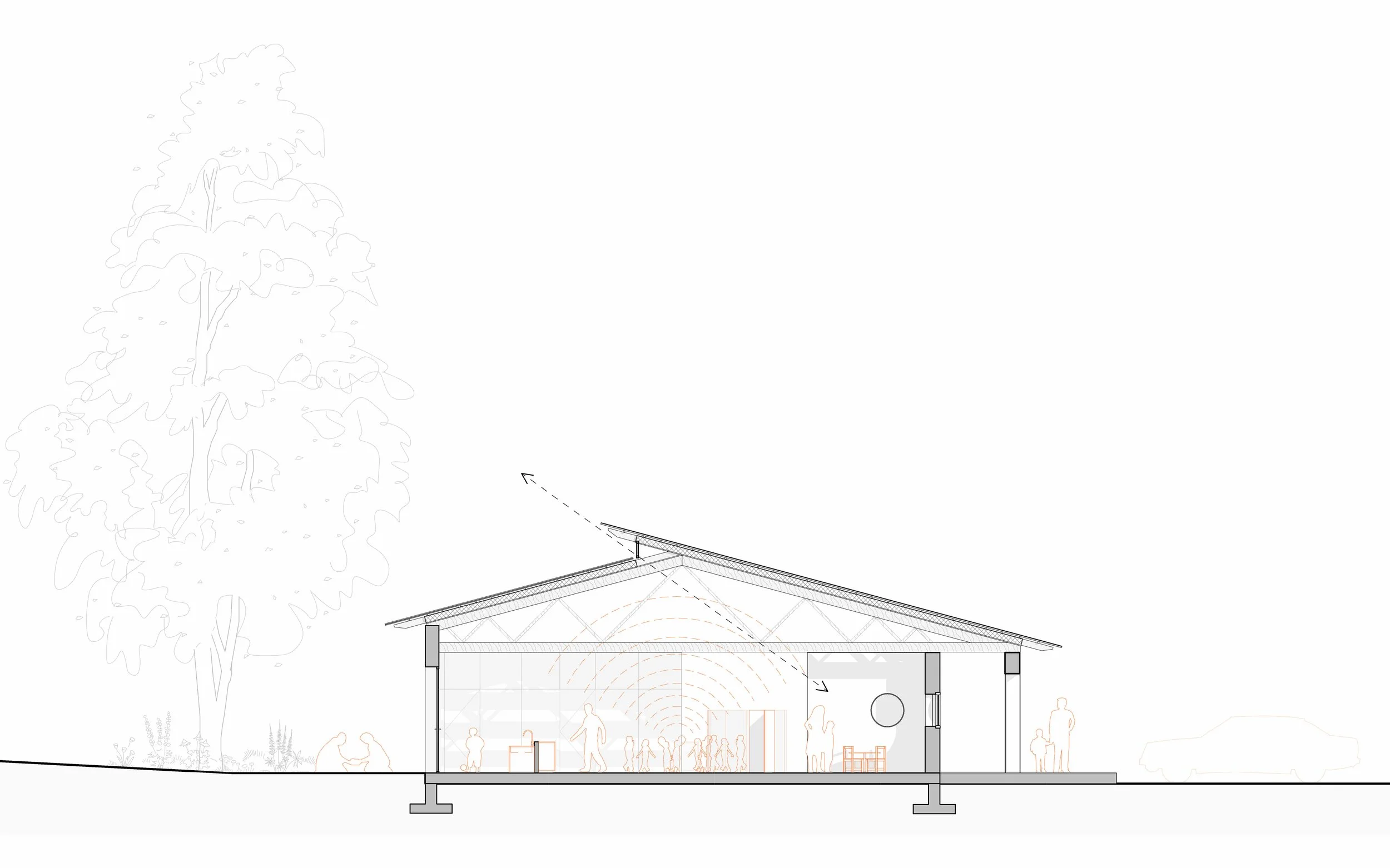Le chapiteau d’origine cède ainsi sa place à une toiture généreuse et isolée, protégeant à la fois les façades et les espaces extérieurs — essentiels dans le concept de libre circulation. L’ancien chapiteau, quant à lui, sera déposé puis réinstallé dans le jardin, transformé en kiosque habité par les enfants. Une seconde vie pour cet objet symbolique, transposable à l’infini.