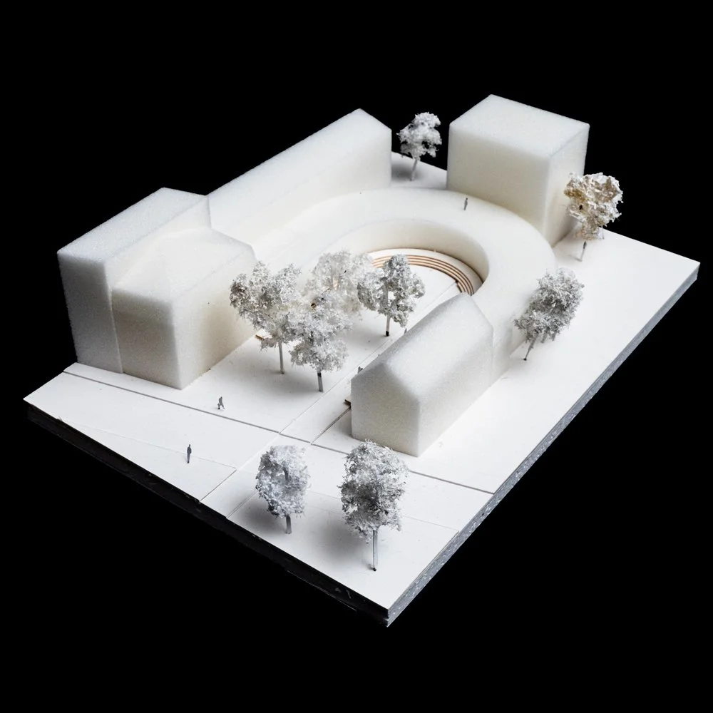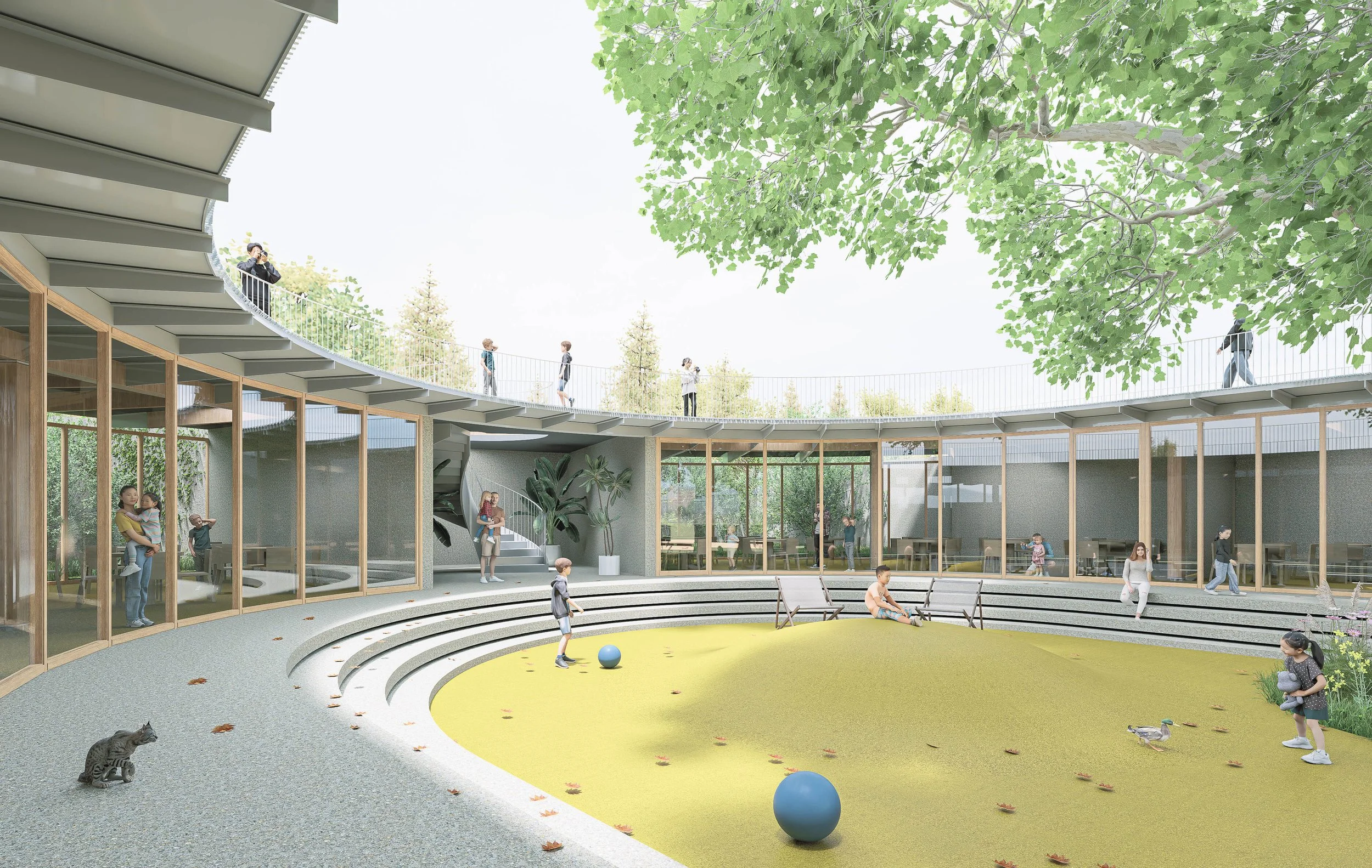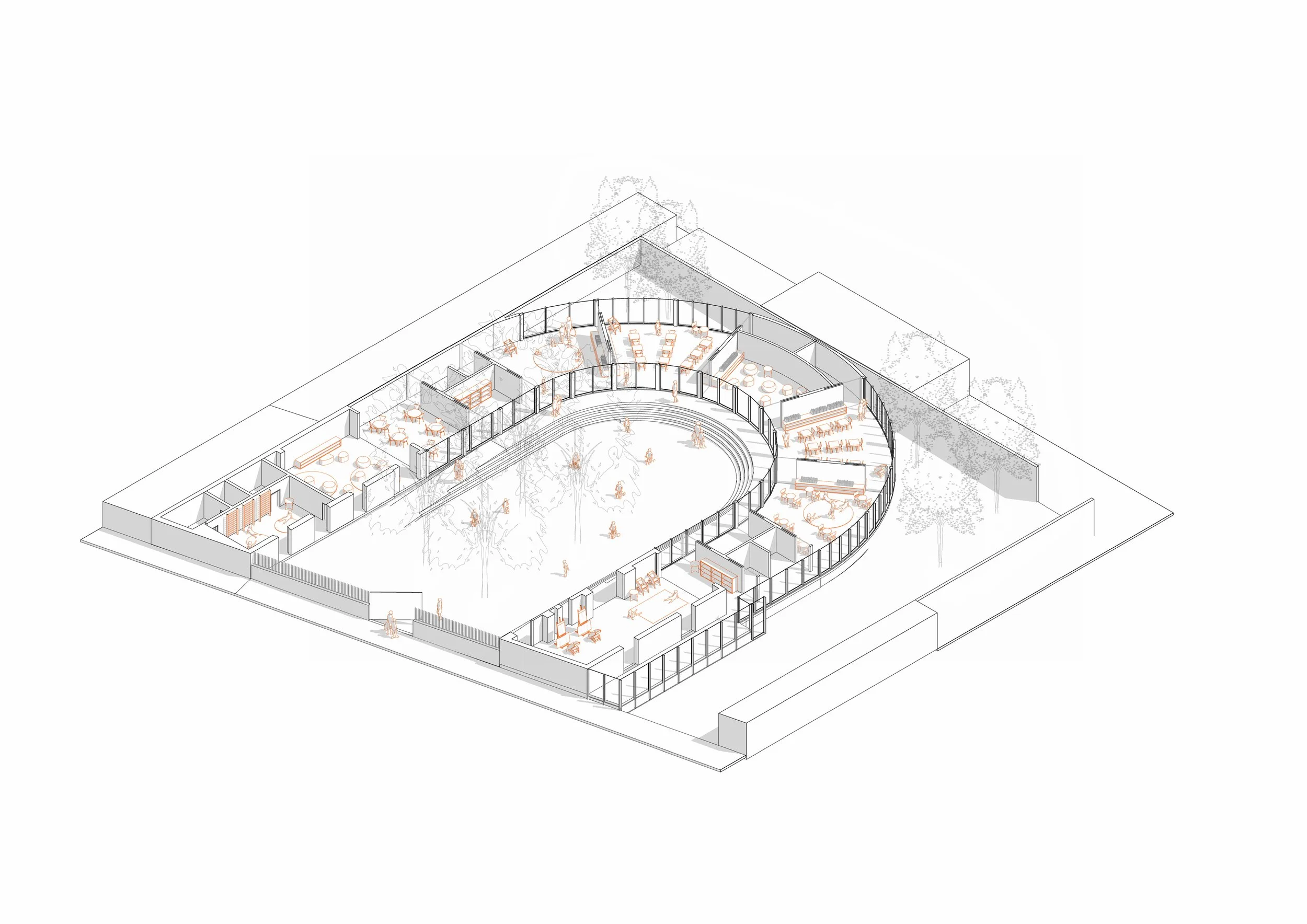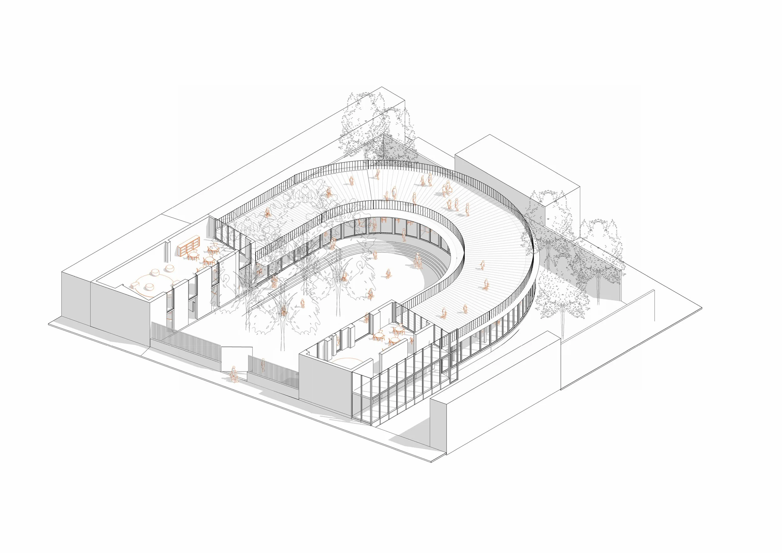 Le projet a pour objectif de lier les deux pavillons historiques avec un bâtiment qui agit comme un cadran de l’évolution. Sa forme courbe et fluide agrandit largement la cour principale et offre aux espaces de classe une évolution douce à travers les âges.